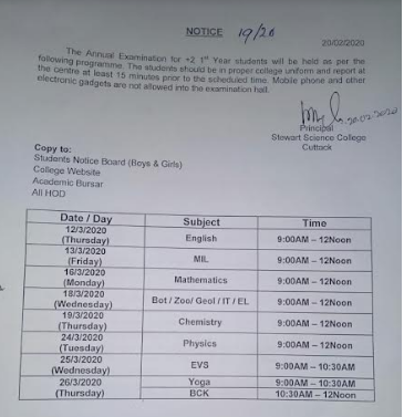+2 Ist Yr. Annual Examination will be held as per the following Programme.